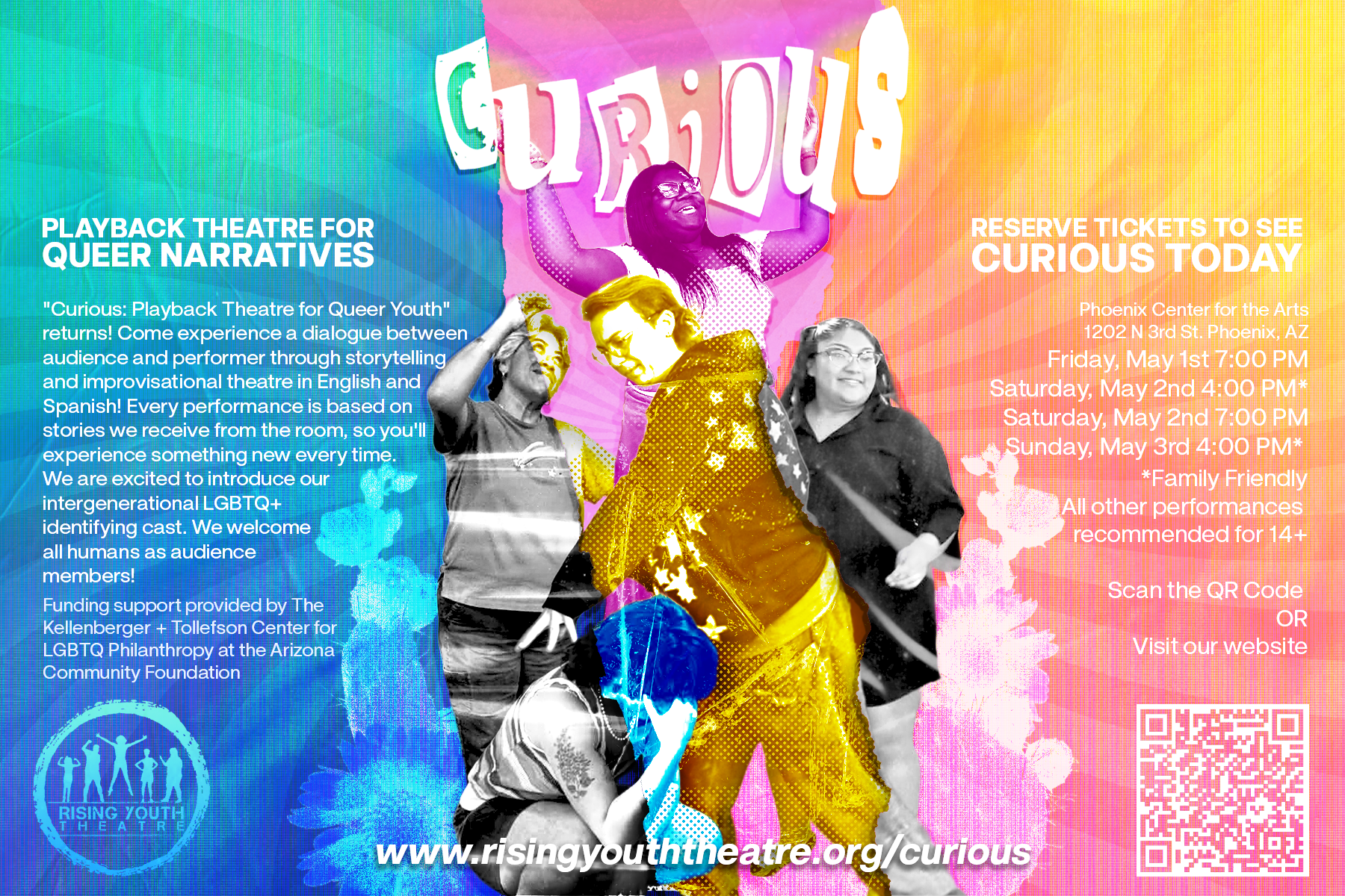 "Curious: Playback Theatre for Queer Narratives" returns! Come experience a dialogue between audience and performer through storytelling and improvisational theatre in English and Spanish! Every performance is based on stories we receive from the room, so you'll experience something new every time. We are excited to introduce our intergenerational LGBTQ+ identifying cast. We welcome all humans as audience members!
