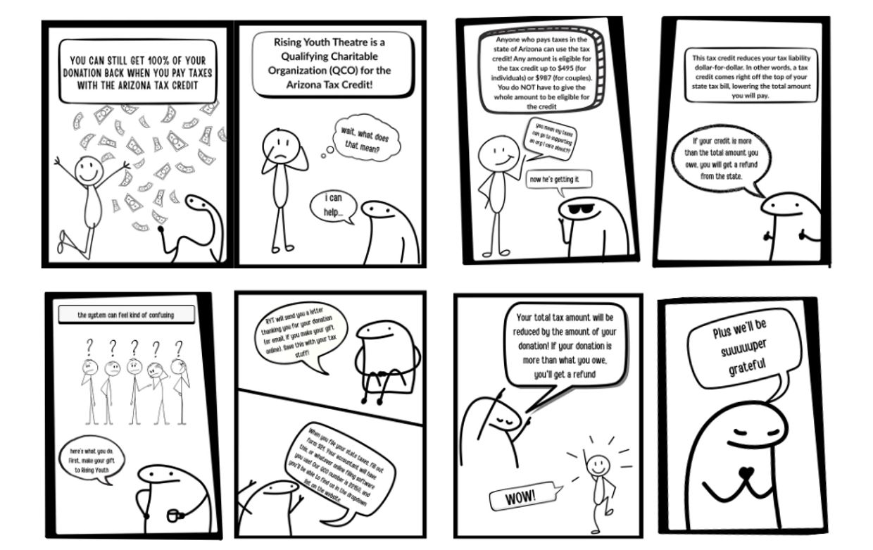 With this status, you can replace your state taxes with a gift directly to Rising Youth Theatre! If you pay taxes in Arizona, you can redirect your tax dollars directly to Rising Youth, receiving your full donation (up to $470 for single filers or $938 for married filers) back as a dollar for dollar tax credit.